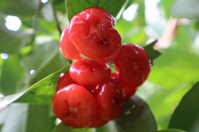 Dřevinu obrůstá okrasné olistění. Kožovité, drobné lístky mají vejčitý tvar. Bílé vonné květy rostou v trsech. Květenství se na keříku objevuje několikrát ročně. Často rostlinka kvete a plody zrají zároveň během celého roku. Plodem jsou malé červené peckovice podobné třešním. Mají lahodnou, mírně kořenitou chuť. Šťavnaté bobule dozrávají během podzimu a zimy. Rostlina rodí už třetím rokem.
