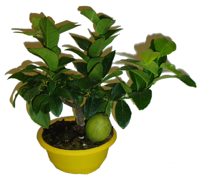 Citrus Lemon Limon v bonsajové misce o průměru květináče 17 cm a výšce cca 26 cm. Rostlina je méně hustá, 1 větev.