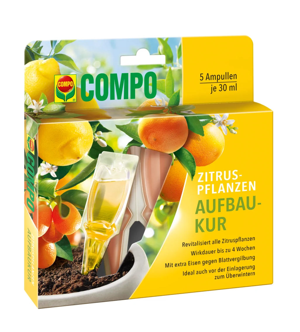 COMPO Regenerační kůra pro citrusy je speciálně vyvinutý přípravek ve formě praktických ampulí, určený pro rychlou regeneraci a posílení citrusových rostlin pěstovaných v květináčích i na zahradě. Tato kúra poskytuje citrusům intenzivní dávku živin a bioaktivních látek, které podporují obnovu vitality, zdravý růst, bohaté kvetení a tvorbu plodů. Díky snadné aplikaci přímo ke kořenům rostliny zajistí COMPO Regenerační kůra rychlý účinek a viditelné zlepšení kondice vašich citrusů.