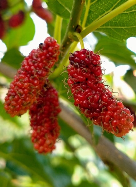 Morus - Morušovník červený - Red je severoamerický ovocný strom s tmavě červenými až purpurovými sladkými plody s bohatou chutí ostružin a malin. Výška 130 až 150 cm.