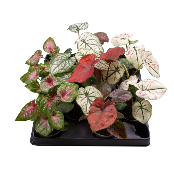 Caladium - Kaládium, známé pro své nádherně zbarvené listy, je exotická tropická rostlina pocházející z Jižní a Střední Ameriky. Díky svým výrazným vzorům a pestrým barvám, které zahrnují odstíny zelené, červené, růžové či bílé, se kaládium stalo oblíbenou pokojovou rostlinou i zahradní dekorací. Rostlina je ideální pro pěstování v interiéru, ale v letních měsících může být umístěna i venku. Kaládium je atraktivní rostlina, která dodá každému prostoru nádech tropické elegance.