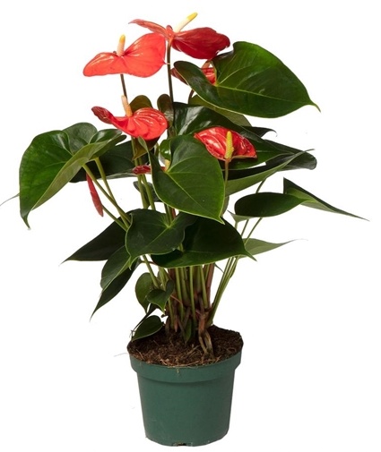 Výška pokojové květiny Anthurium cca 70 cm, průměr květináče 19 cm. Rostlina je oblíbená pro svůj exotický vzhled.