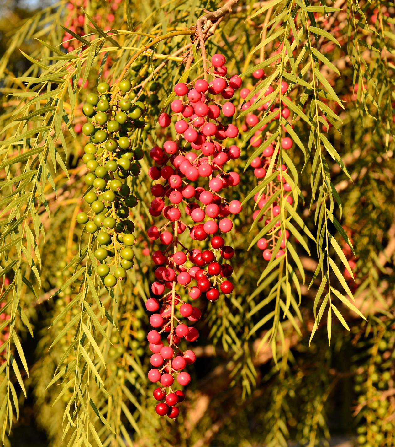 Schinus molle neboli pepřovec obecný, známý také jako peruánský pepřovec, peruánský mastixový strom nebo falešný pepř, je fascinující rychle rostoucí stálezelený strom nebo keř z čeledi ledviníkovitých pocházející z And. Zaujme elegantně převislými větvemi s jemnými světle zelenými zpeřenými listy připomínajícími vrbu nebo bambus příjemně vonícími pryskyřicí a pepřem při rozemnutí, drobnými krémově bílými až žlutavými kvítky v hustých latách a především nádhernými hrozny drobných kulatých plodů nejprve zelených pak dozrávajících do intenzivně růžové až červené barvy připomínajících korálky nebo malé třešně s charakteristickou pryskyřičnou pepřovou vůní a chutí. Plody pepřovce obecného jsou světově známy jako růžový pepř nebo peruánský pepř a používají se v gastronomii jako kořenina. Pepřovec obecný je jednou z nejelegantnějších a nejdekorativnějších subtropických dřevin vhodných pro středoevropské zimní zahrady a terasy. Ilustrační foto.