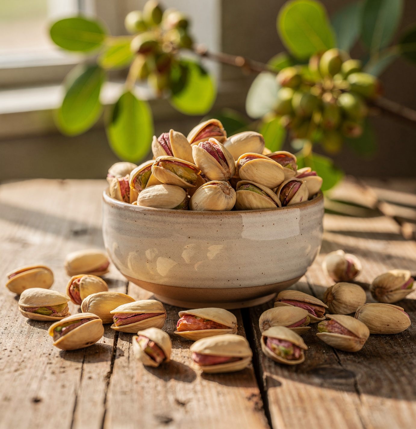Sklízejte plně zralé plody v září až říjnu kdy skořápka přirozeně puká. Oříšky sušte na vzduchu nebo v troubě při nízké teplotě. Pistácie jsou mimořádně bohaté na bílkoviny, zdravé tuky, vitamín B6, thiamin, fosfor, měď a antioxidanty. Konzumují se čerstvé, pražené nebo solené a používají se v kuchyni do dezertů, zmrzlin, pesta, baklavi a mnoha dalších pokrmů.