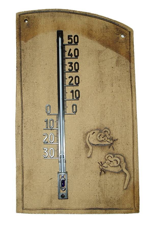 Ručně vyrobený teploměr s rozměry 33,5 x 20 cm. Provedení se může lišit.